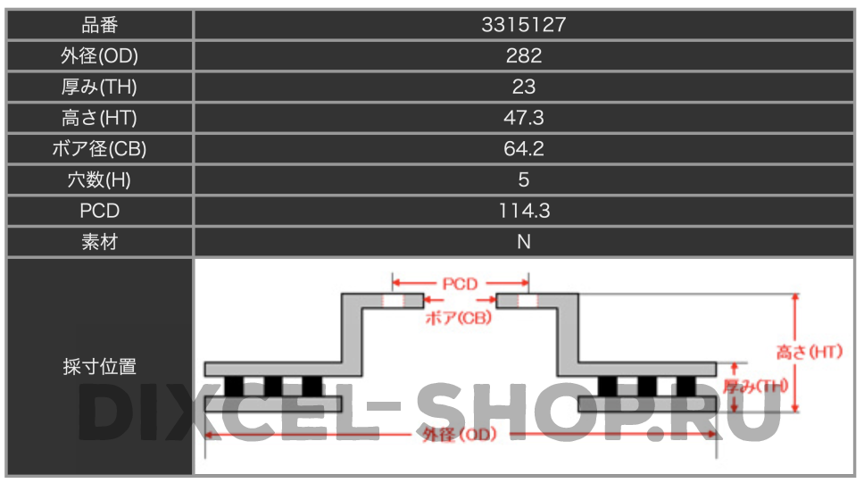 Применимость тормозных дисков Dixcel PD 3315127S по данным японского оригинального каталога Dixcel